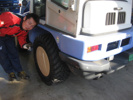 ショベルローダ用の冬タイヤは乗用車と異なりスタッドレスタイヤではなく