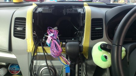 写真は純正CDデッキを取り外し、配線を組み付けているところです