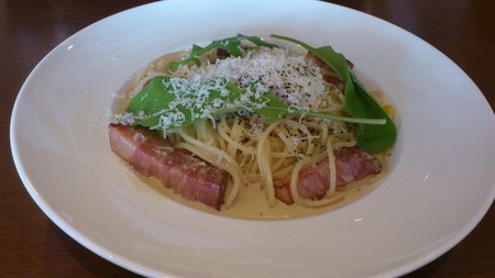 妻は温泉卵やベーコンが入ったカルボナーラ