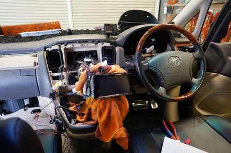 写真①~インストール済みのナビを一旦バラし配線を取り回しリンクさせます