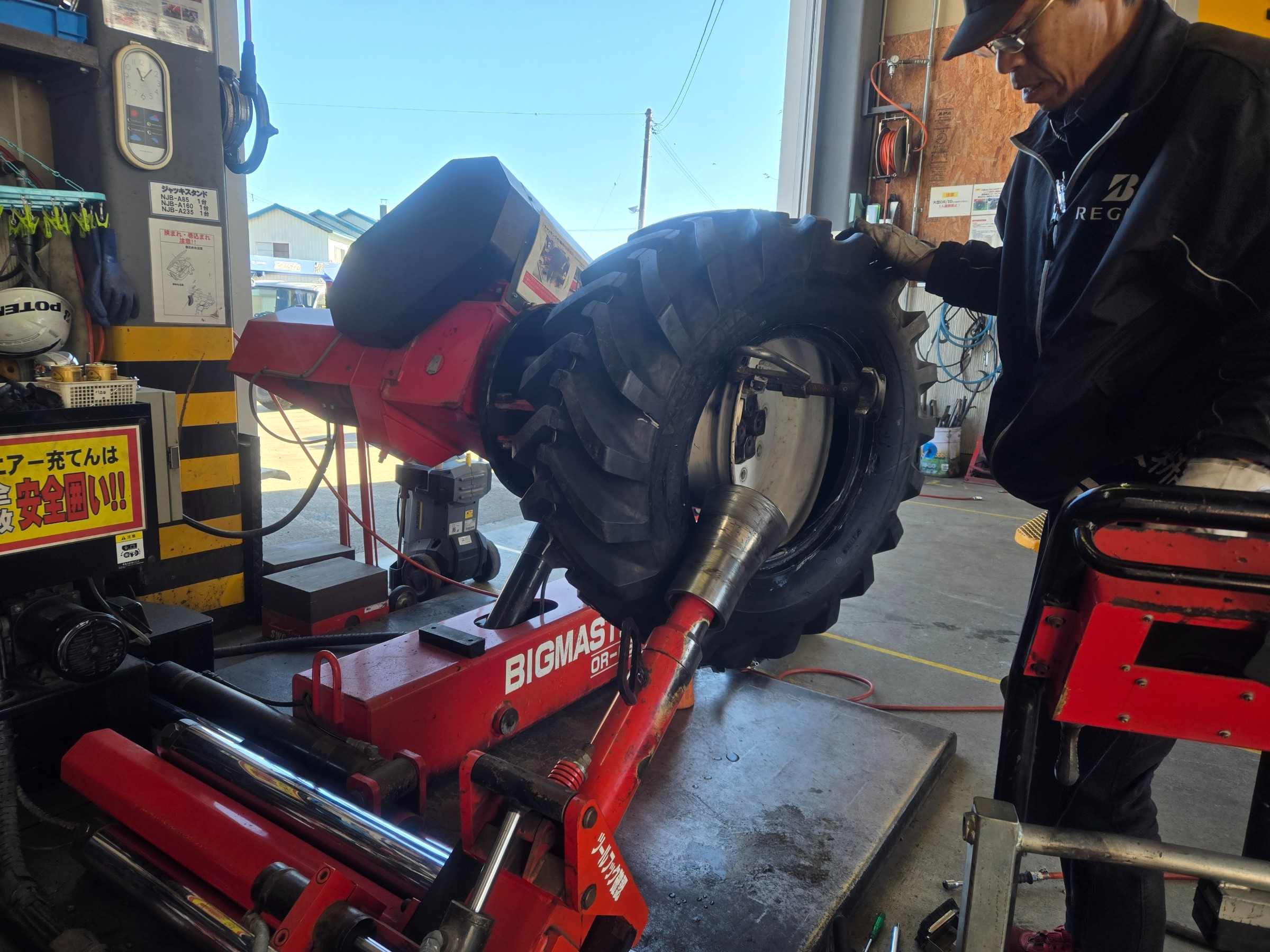 ミニショベルのタイヤを組む横で