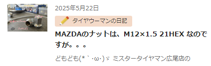純マツダ車(OEM除く)の中には、標準で17HEXナット装着車が存在します。2019年に製造された車両(販売を含めると2020年製も含まれます)に17HEXが一度使われているのです。2020年から再び21HEXに戻されましたので、当店でも17HEXは2台しか見たことがありませんが、確かに存在はしています