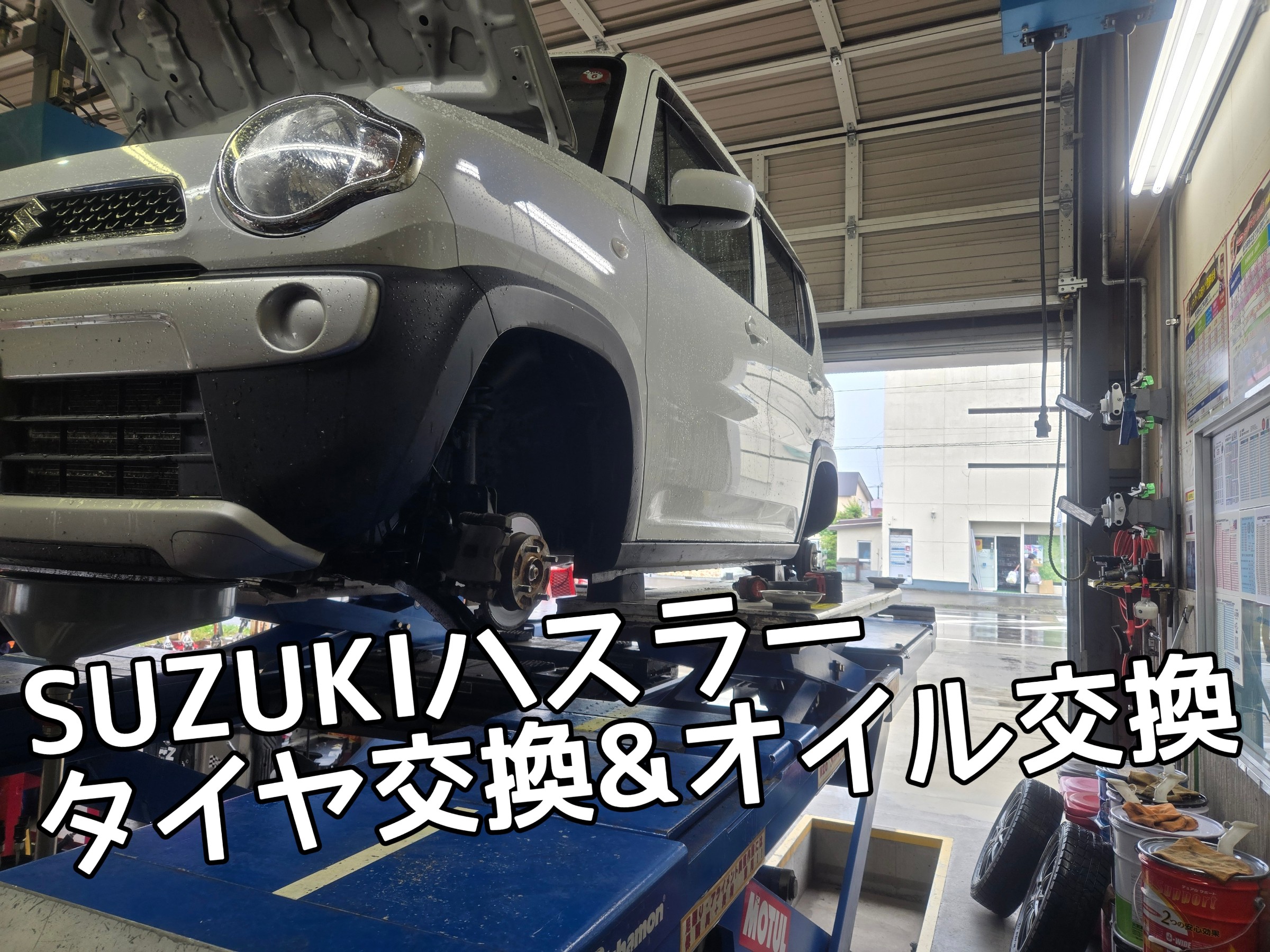 作業日は6月後半。まだスタッドレスタイヤだったハスラー様。当店で一番遅いタイヤ交換かな~・・・?オイル交換作業もしま~~~す!