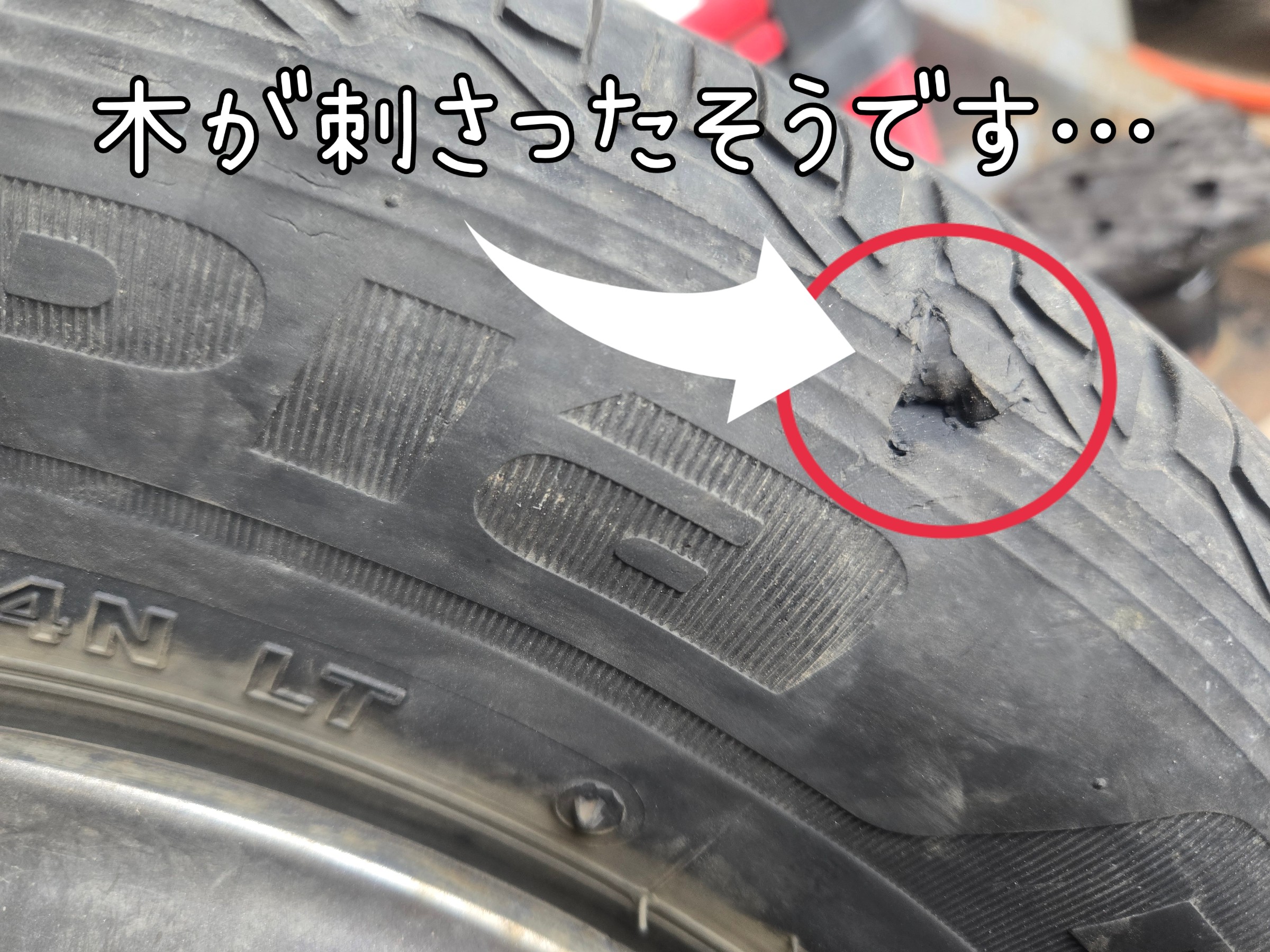 一瞬、先日修理したタイヤが