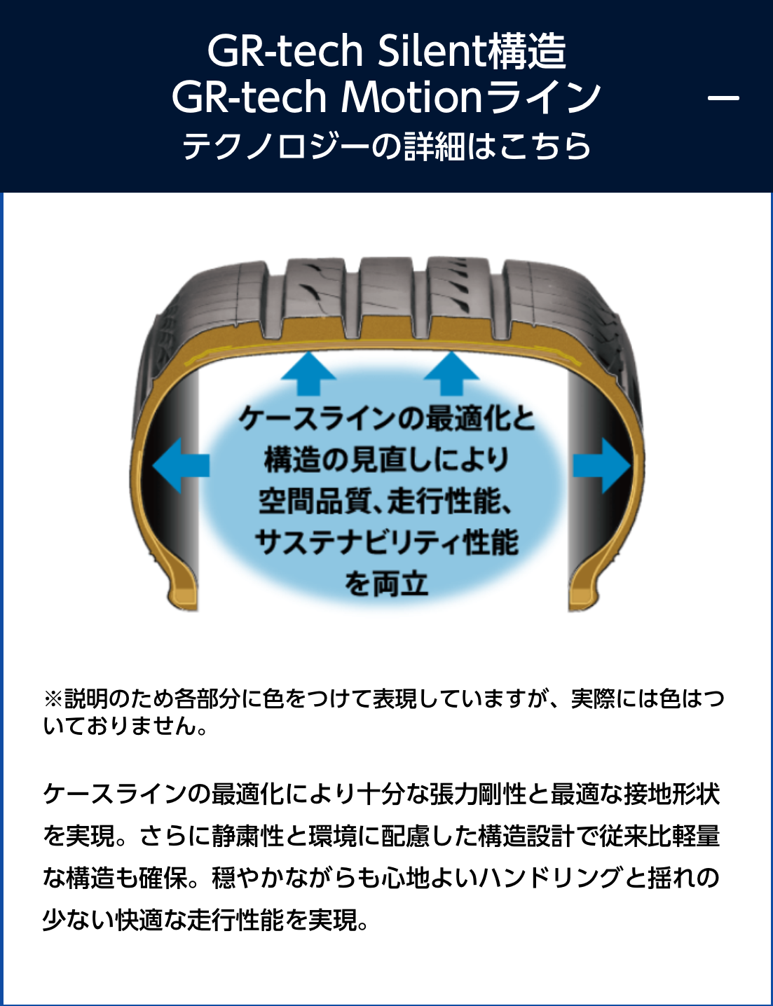 これは新品から摩耗したタイヤでも静粛を求めた技術ですがその分、トレッド剛性が