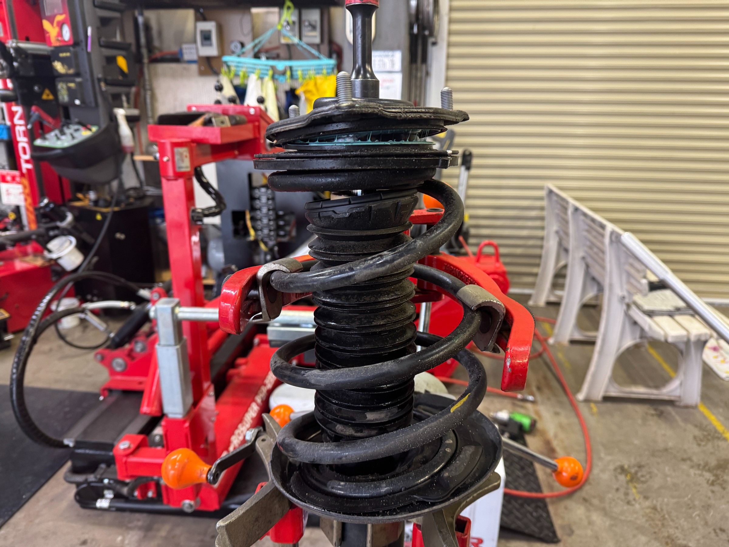 写真はスプリングコンプレッサーという器械でバネ交換をしている様子です