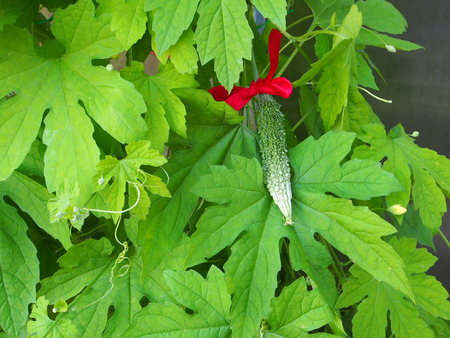 赤いリボンは、ここにゴーヤがありますという目印なんですけど・・