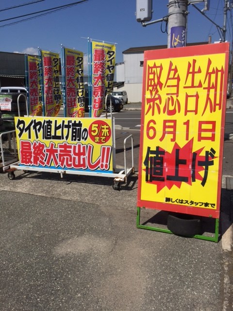 5月末までは現状価格で対応させていただきますので、お車、タイヤのことで気になることがございましたら、下記看板を目印にお気軽にご来店ください!スタッフ一同誠心誠意対応させていただきます。