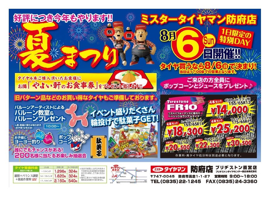 冒頭からさっそく本題ですが、今年も来たる8月6日の日曜日にミスタータイヤマン防府店の夏祭りを開催させていただきます!バルーンアート教室(お子様、女性に限ります)やヨーヨーつり、ポップコーンに輪投げでお菓子をゲット!、お楽しみ抽選会等さまざまなイベントが目白押しです。\(^o^)/