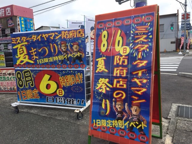 皆様、この8月6日はこの看板を目印に是非ミスタータイヤマン防府店にご来店ください!スタッフ一同心よりお待ちしております!