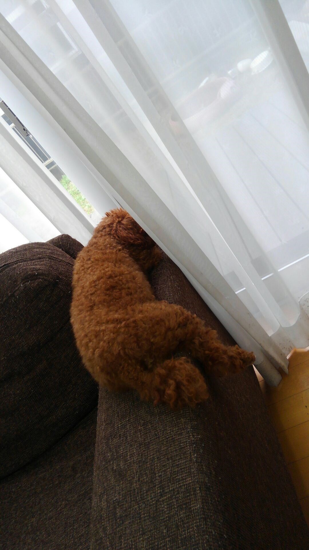 子供達が学校へ行った直後の風景です。「早く帰ってきて、待ってるワン」と言わんばかりのおきまりポジションです!!