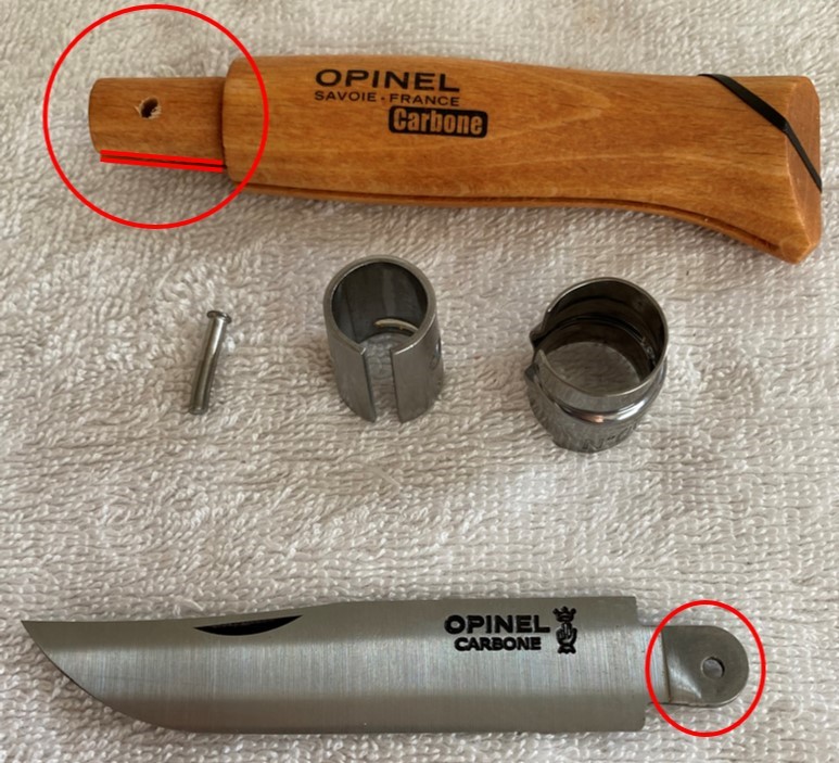 上図の柄とブレードの赤丸部分の勘合部の削りが甘くめっちゃ固くなってしまい、さらにブレード収納時には奥まってしまうので水が溜まりやすく赤錆が付着、もう手では開くことができなくなってしまいました(´-ω-`)