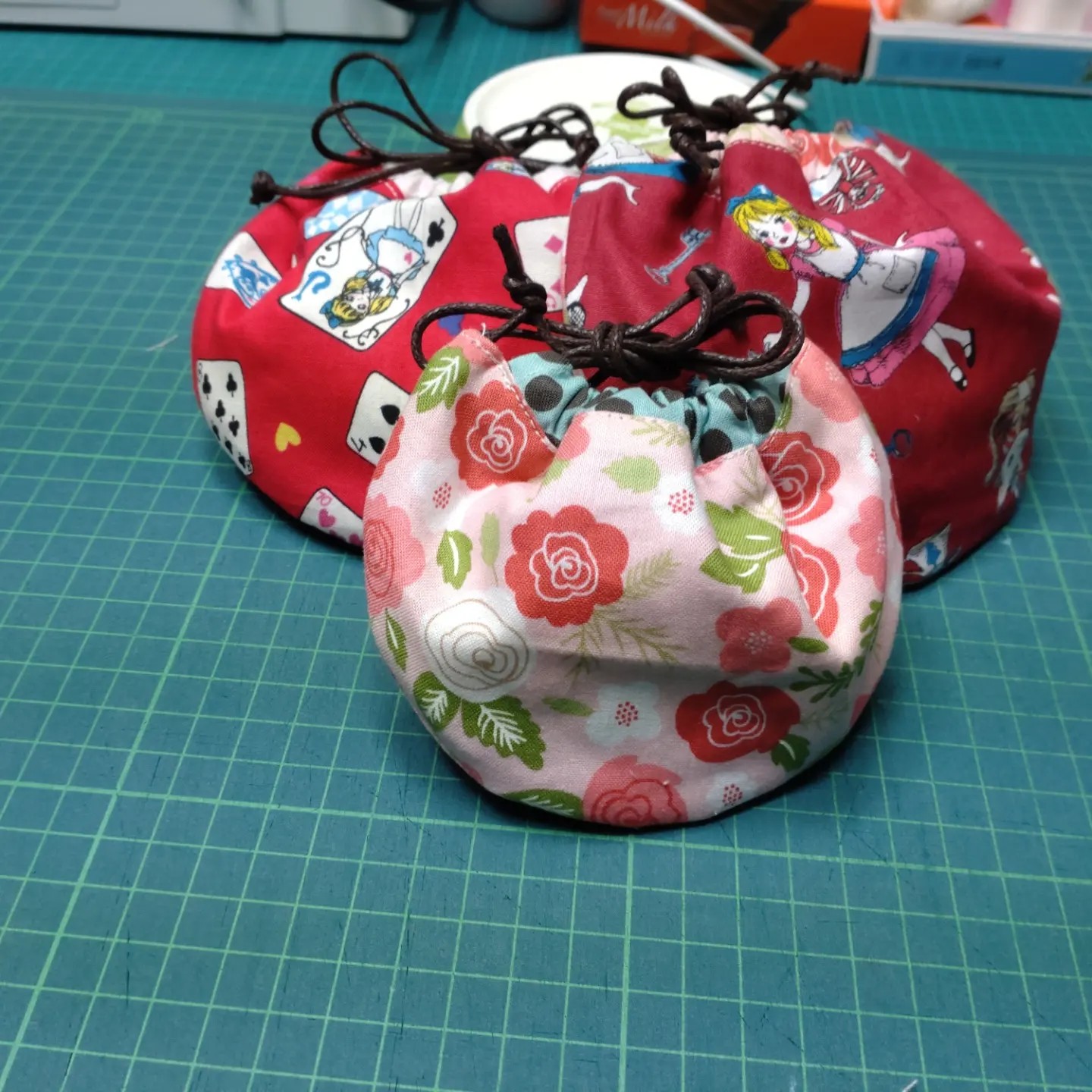 小さいものをちまちまと作り、写真のような巾着袋が沢山出来上がったりしてます。