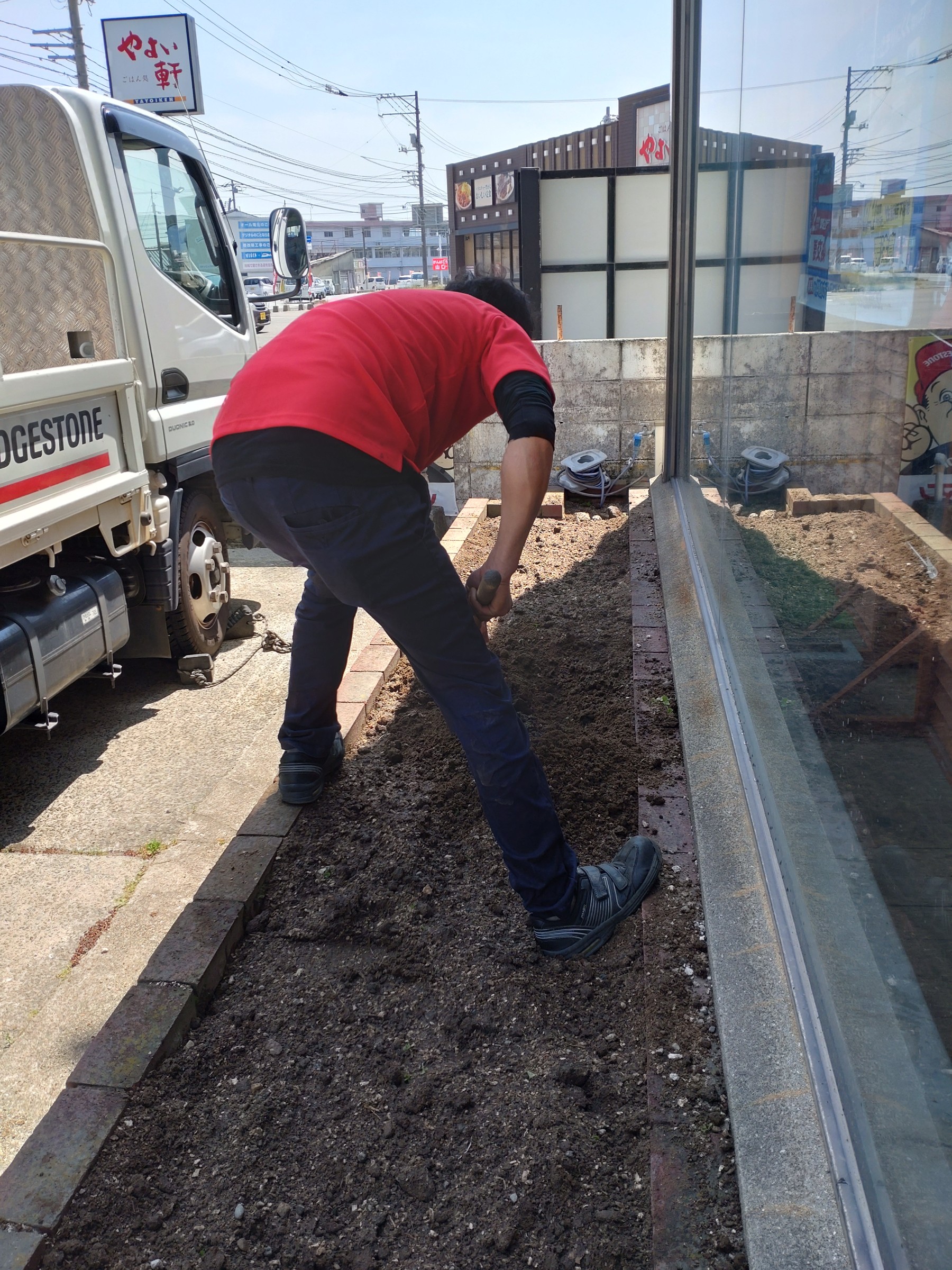 花壇で何やらされてますが・・家庭菜園ではなくミスタータイヤマン防府店菜園???でしょうか。