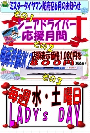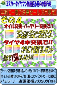 防府店6月のイベント情報 2015年6月10日 TOPでお知らせしてます。グルメイベトとは、別に開催中のイベントもあるんです。少しだけお知らせをしておきます。毎週水・土曜日は、レディースデー今月は、シニアドライバー応援月間梅雨準備ワイパーお得キャンペーンさらに・・・メインが・・・ご来店キャンペーンで・・・テッシュBOXが・・・さらに・・オイル交換で・・・さらにタイヤ交換で・・最大・・・・○○個も・・・貰える・・・詳しくは、スタッフまで・・