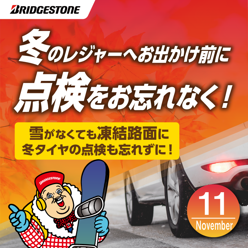| 家族や大切な方の笑顔のために、ウインターレジャーへのお出かけ前にはタイヤ点検を! みんなでスキー、スノボ、はたまた温泉などの行き帰りで、もしタイヤトラブルで立ち往生 楽しい思い出となるはずが台無しです。 雪の降る地域や路面凍結が予想される地域へのお出かけ前にはスタッドレスタイヤのチェックは必須です。 当店スタッフがしっかりチェックします。お気軽にお問合せください。 |