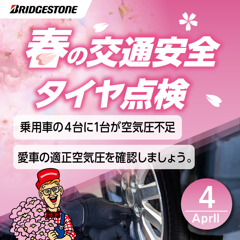 待ちに待った春はすぐそこ!4月8日は交通安全の日です。乗用車の4台に1台は、空気圧不足のタイヤで走行しているそう!(JATMA調べ)