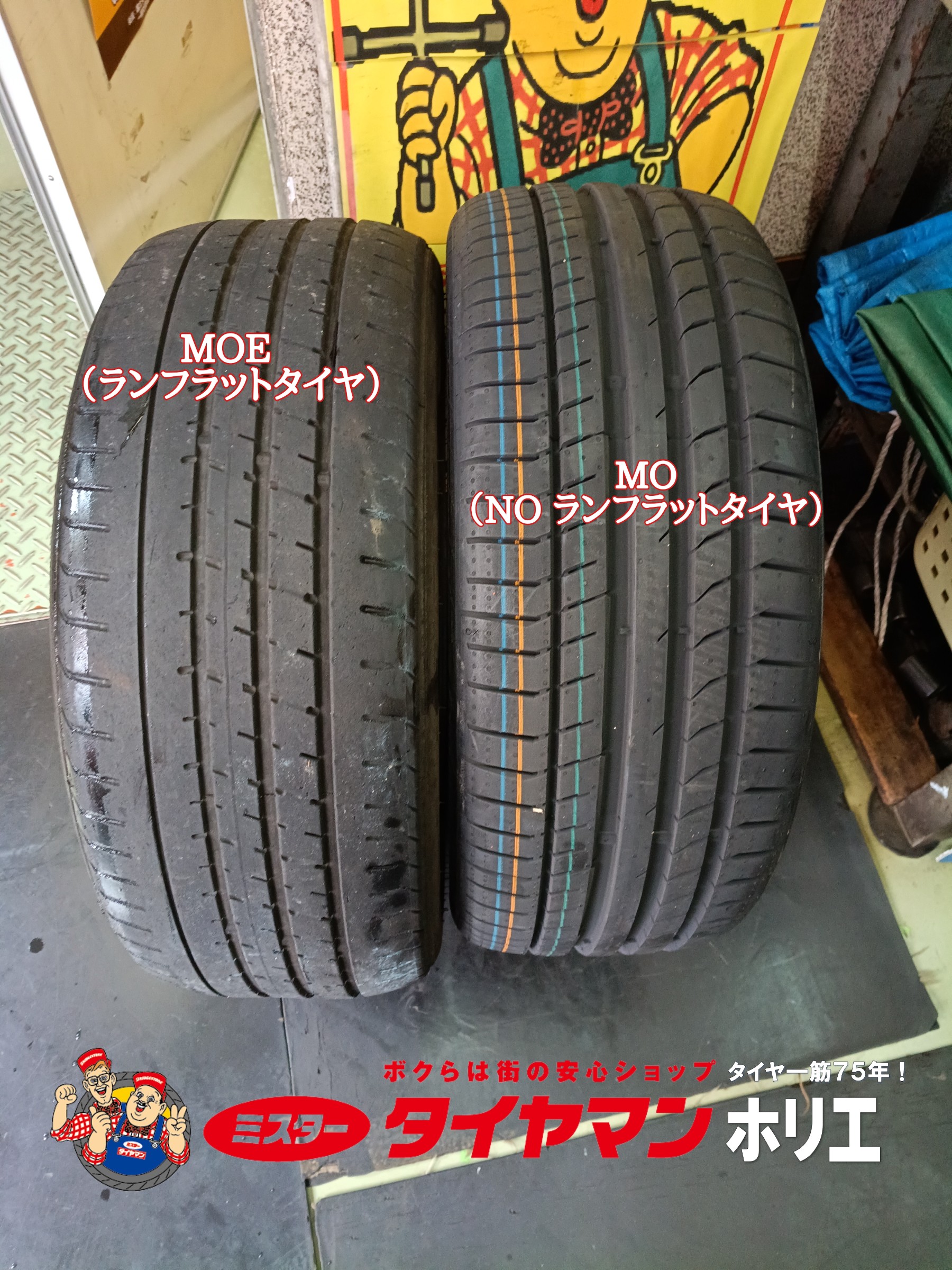 交換前はランフラットタイヤMOE(パンクしても80km/hのスピードで80km走行可能)が装着されていました