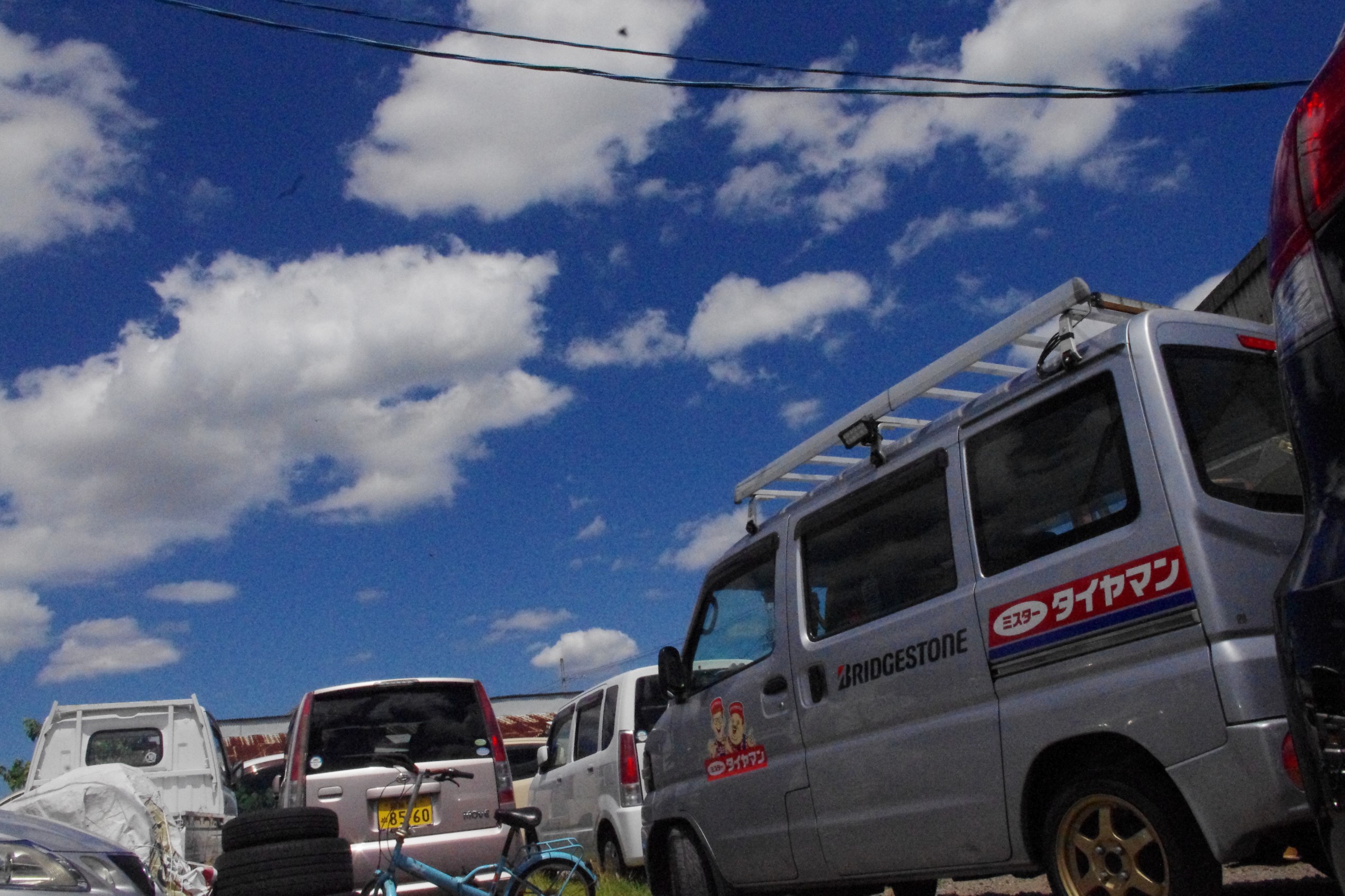 今朝の夏空とタイヤマン号☆彡台風の影響なのか綺麗な青空でした♬