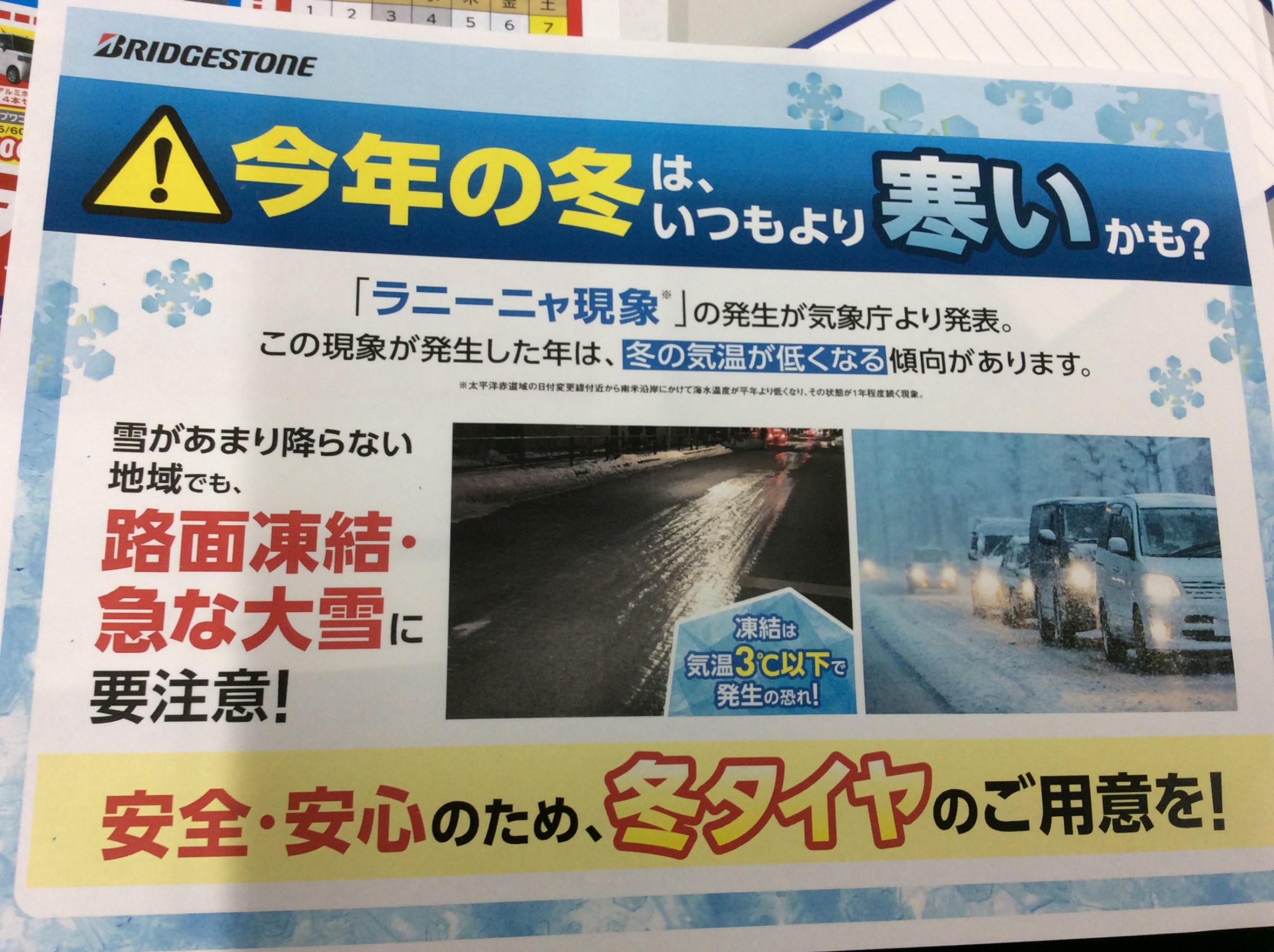 ですが、着々と冬の気候になってきております。朝晩は寒くなり路面凍結の危険もありますので、