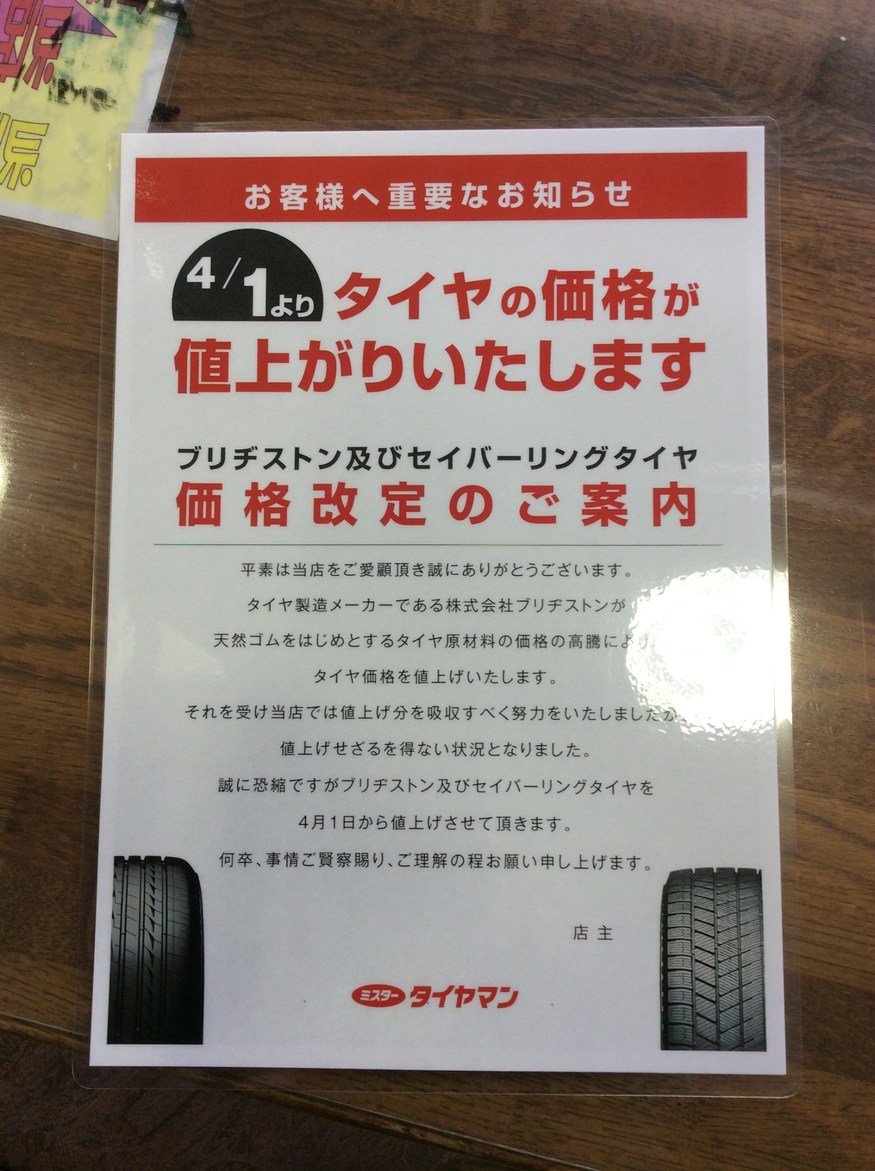 2022年4月1日よりメーカーからの値上げがありタイヤの販売価格が