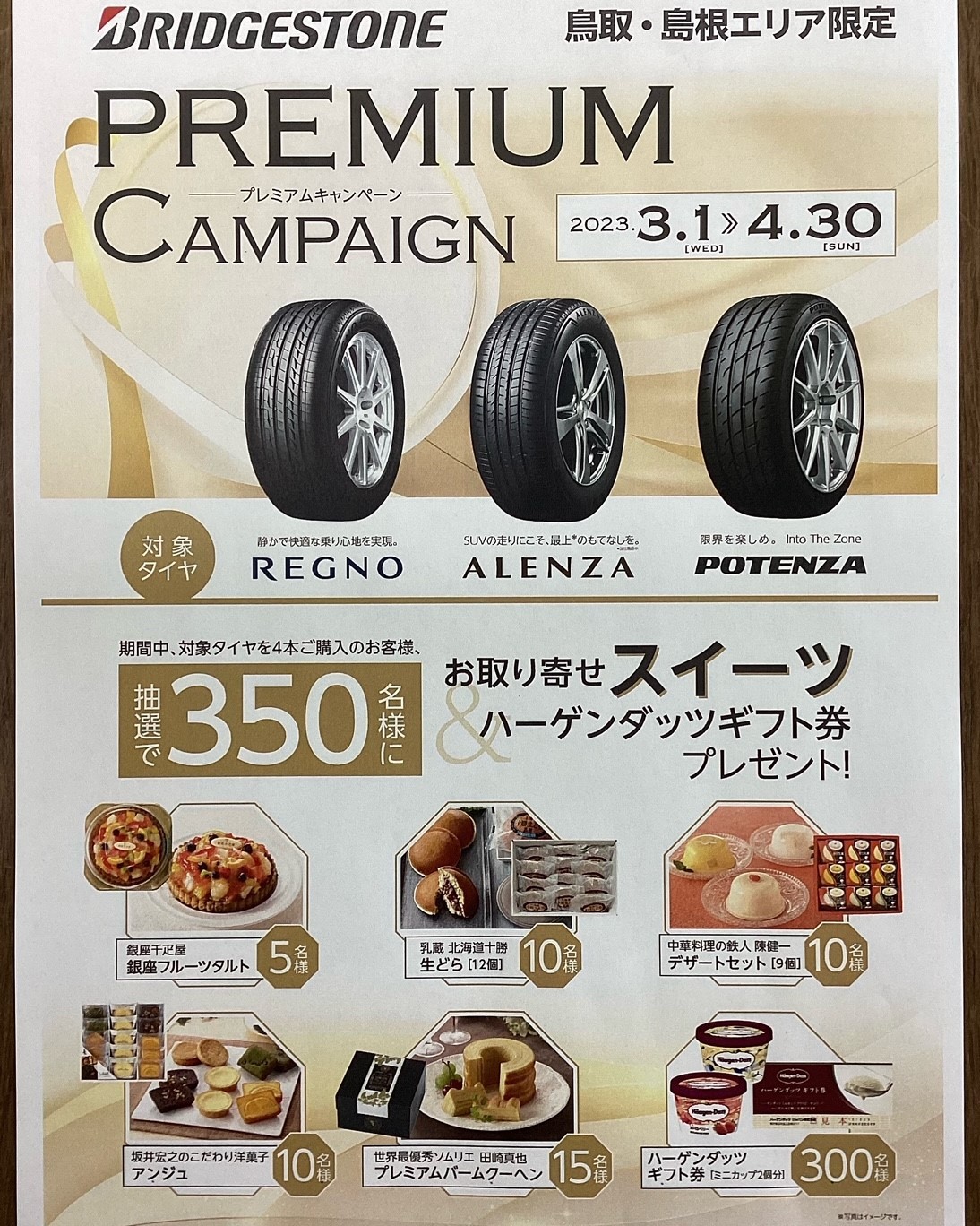 こちらは、ブリヂストン製タイヤを4本お買い上げのお客様へ抽選で350名様に『お取り寄せスイーツ&ハーゲンダッツギフト券』をプレゼント