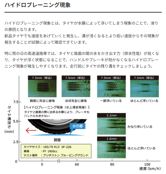 タイヤの残りミゾが少ないと、雨の日にタイヤが道路から浮いてしまうかも・・・