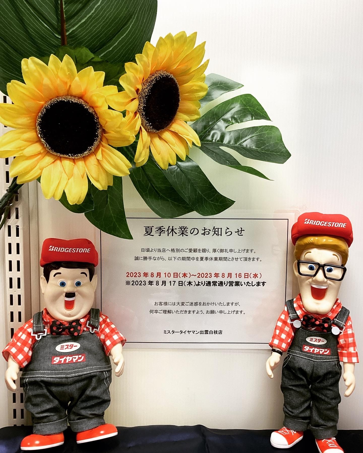 2023年 夏季休業のお知らせ 2023年8月9日 いつもミスタータイヤマン出雲白枝店の ホームページを見ていただき、 ありがとうございます<(_ _*)> 本年の夏季休業日を 下記の通り実施させていただきます。 【期間】 2023年8月10日(木) ~ 8月16日(水) お客様には大変ご不便をお掛けしますが、 何卒宜しくお願い致します。 ミスタータイヤマン出雲白枝店 スタッフ一同