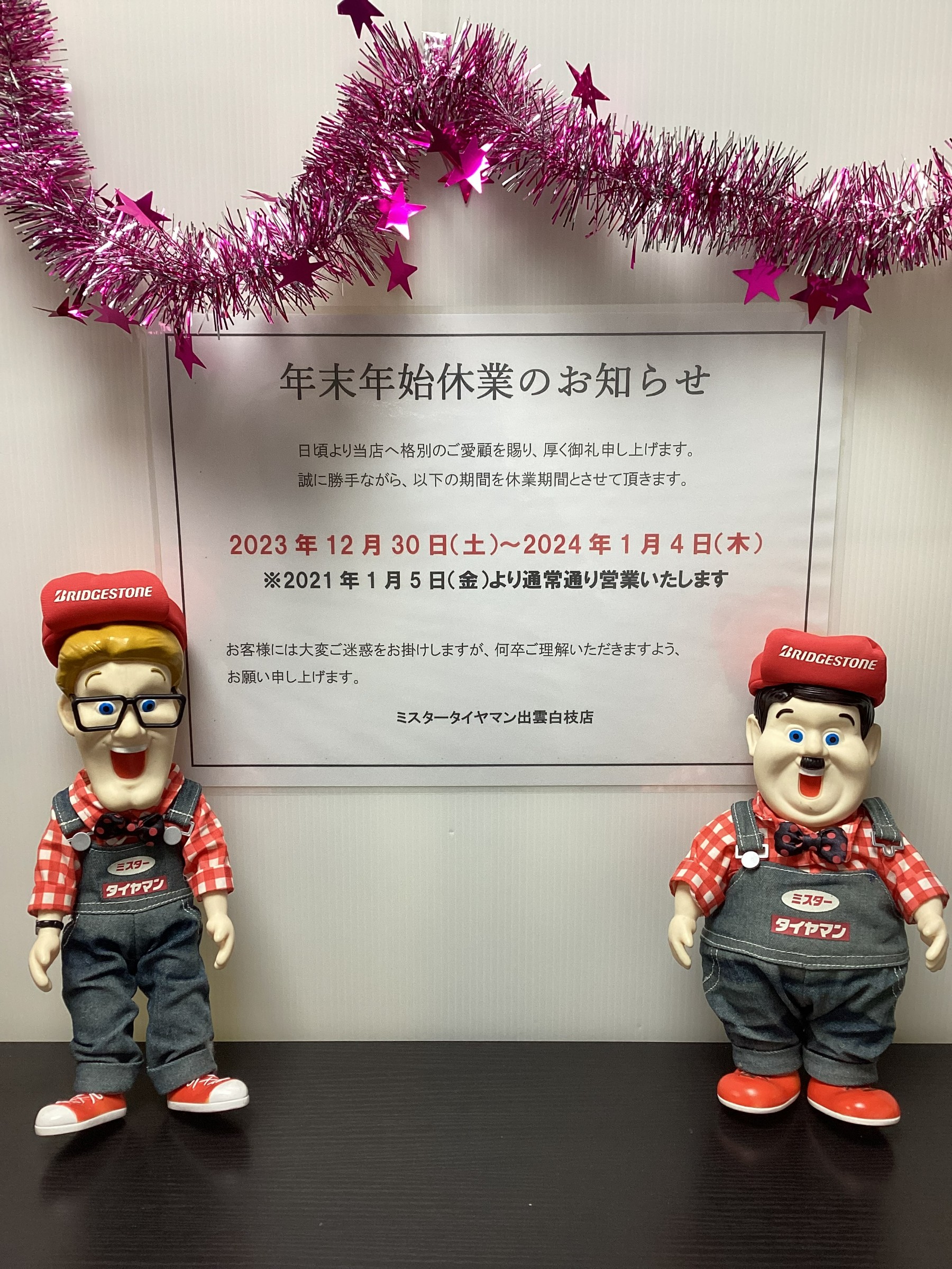 年末年始休業日のお知らせ 2023年12月23日 いつもミスタータイヤマン出雲白枝店の ホームページを見ていただき ありがとうございます<(_ _)> 年末年始の休業日を 下記の通り実施させていただきます。 【期間】2023年12月30日(土) ~ 2024年1月4日(木) お客様には大変ご不便をおかけ致しますが、 何卒ご了承くださいますようお願い申し上げます。