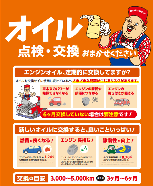 エンジンオイルは定期的に交換していますか? 交換しないままクルマを使い続けると、本来のパワーを発揮できなくなるだけでなく、エンジンのトラブルや破損のリスクも生じてきてしまいます。 最低でも『 5,000㎞ または 6カ月 』おきには交換するようおススメしています。 また『 オイル交換2回に1回 』はオイルエレメントの交換もお忘れなく!