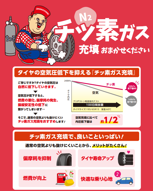 チッ素は酸素よりも分子が大きいためゴムの隙間を通り抜けにくいので、長い期間にわたり空気圧を一定に保つことができるようになります。また温度変化に強く、ホイールの酸化防止の効果もあります。
