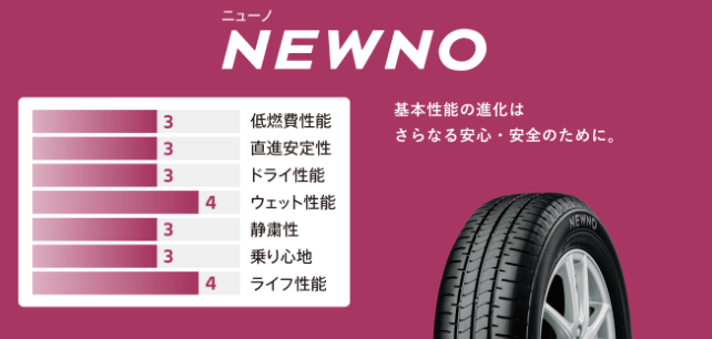 クルマの進化とともにタイヤに大切な性能として、低燃費性能や直進安定性など図にのっている7つの性能があげられます。このニューノは、この性能をバランスよく発揮できるタイヤですので、多くのクルマにピッタリ合います。