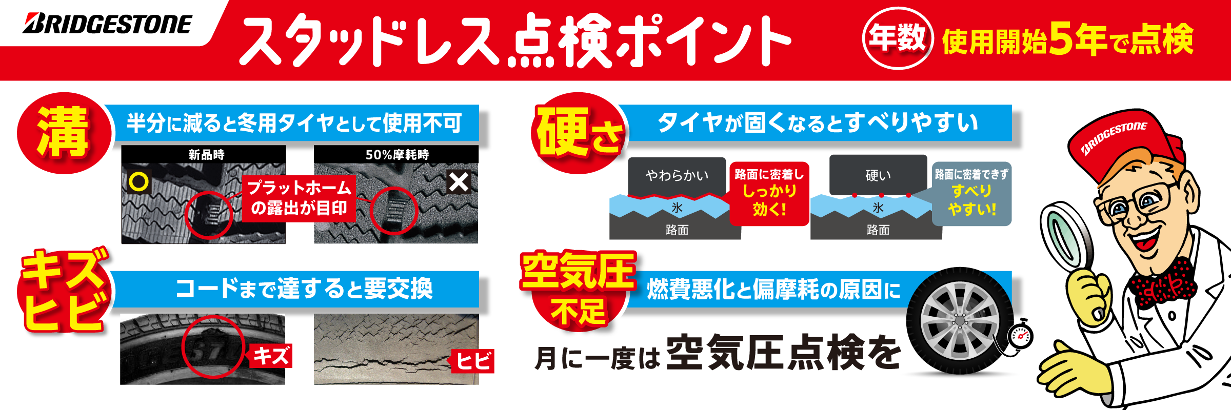空気圧、摩耗状況、キズ・ひび割れなどもちろん、ゴムの硬さも重要です。