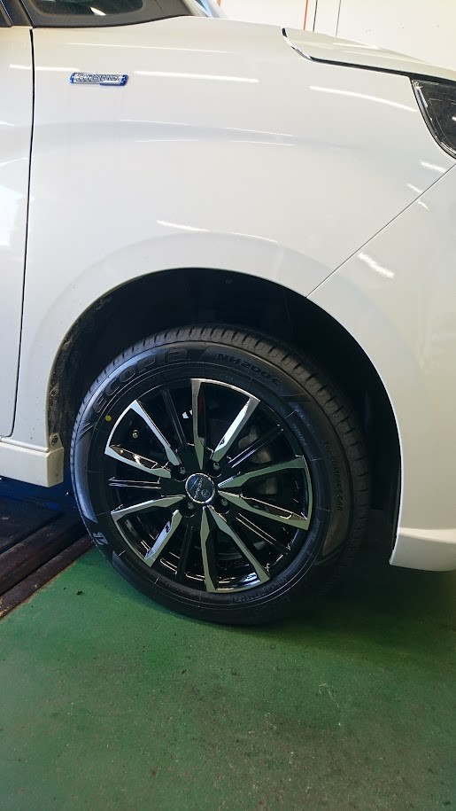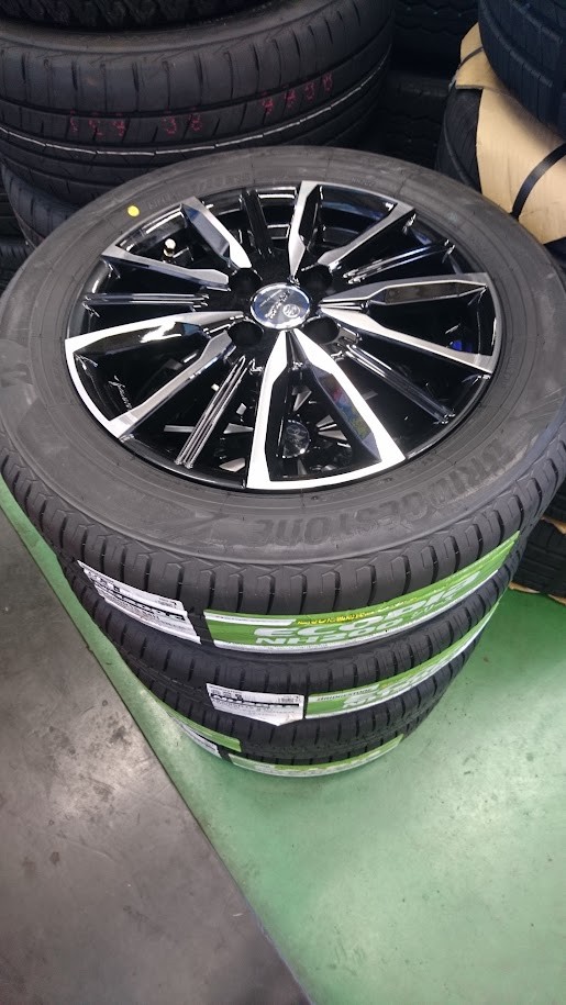 純正と同じ15インチですが、タイヤサイズを165/65R15から185/60R15へ変更それに伴いアルミホイールの幅も4.5Jから5.5Jへ変更しました。安定感が増します(*^^*)
