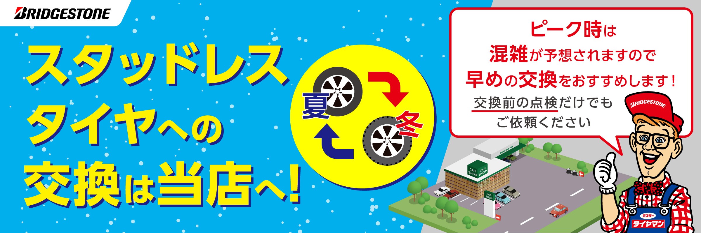 11月は休まず営業いたします!! 2025年11月3日 皆さん、いつも当店をご利用いただきありがとうございます。 スタッドレスタイヤへの交換始まってます!! 11月は休まず営業いたします 当店は、タイヤ交換作業も予約なしでお受けいたしています ご来店の順番通り作業いたしますが混雑状況によっては待ち時間が出る場合がありますので あらかじめ余裕をもってご来店ください。 早めの交換で、安心安全!!