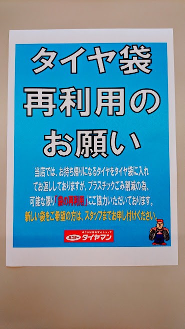 「タイヤお持ち帰り袋」再利用のお願い 2021年10月3日 皆さん、いつも当店をご利用いただき誠にありがとうございます。 これから冬タイヤへの履き替えのシーズンがやってきますが、当店から 「タイヤお持ち帰り袋」「ナット袋」の再利用推進のお知らせです。 昨今の世界的環境問題の観点から、プラスチックごみの削減が叫ばれています。 当店でもプラスチック削減の為、可能な限り「袋の再利用」をさせていただいております。 新しい袋をご希望の方は、お気軽にスタッフまでお申し付けください。 ごみの削減と環境保全の為に、 ご理解とご協力を宜しくお願い致します。