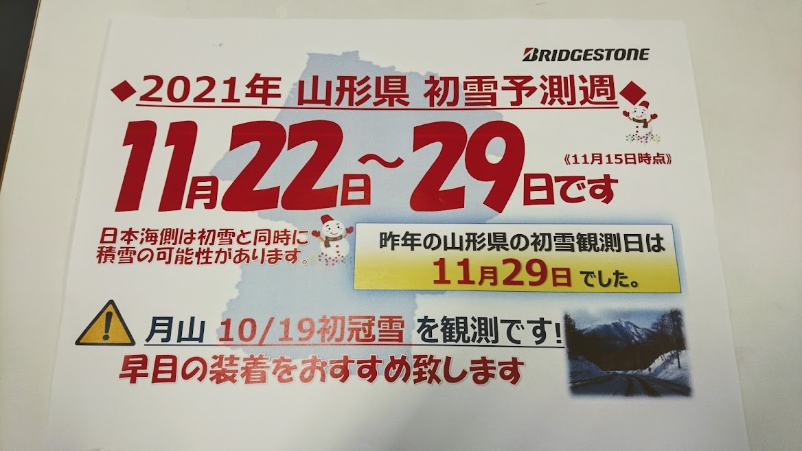 山形県初雪予報!! 2021年11月17日 山形県 2021初雪予報⛄ 皆さんはもうスタッドレスタイヤに交換しましたか?? 峠越えの方は路面がいつ凍結してもおかしくない日が続いています。 ブリヂストンより山形の初雪の最新予報が出ました! 週間予報を見ると、11月27日(土)辺りに雪マークが出ています。 交換作業のご来店も増えています、特に週末は混雑が予想されますのでお時間の余裕をもってご来店ください。