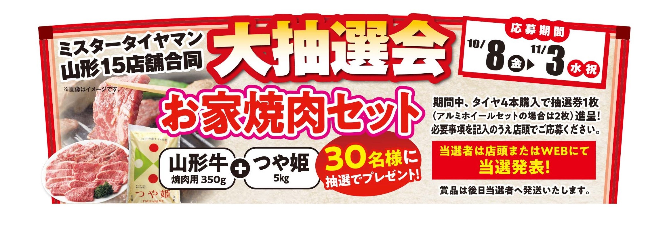 「お家焼肉セットが当たる大抽選会」 当選者発表!!! 2021年11月18日 皆さま、おまたせしました! 11月3日まで行われました、「ミスタータイヤマン山形15店舗合同大抽選会」の当選者が決まりました!! 幸運な30名様はどなたでしょうか!!! 当選者の皆さまの一覧は・・・・ミスタータイヤマン上山「スタッフ日記」をご覧ください!