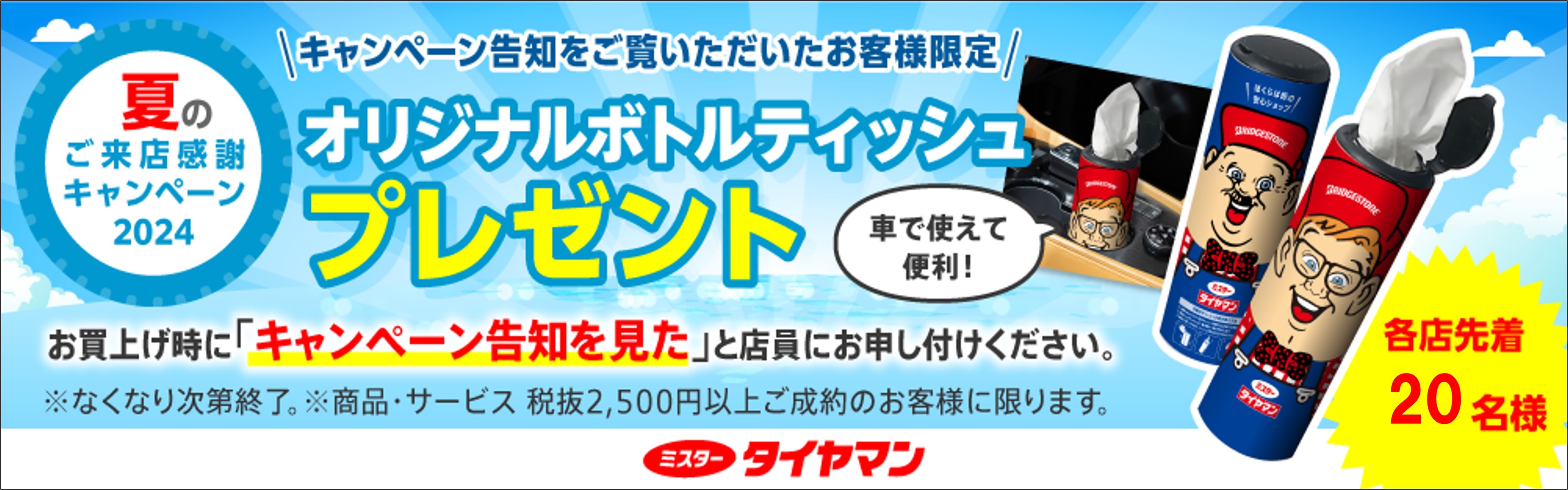 夏の大感謝祭開催!! 2024年6月21日 皆さん、いつもご覧いただきありがとうございます。 6月22日(土)~7月7日(日) 「夏の大感謝祭」開催いたします!! 夏タイヤはもちろん、これからの季節にバッテリーやワイパーなど お買い得にご用意しています! 6月いっぱいは上山市の電子マネーの還元キャンペーンも やっていますのでさらに最大20%もお買い得です!! さらに、「オリジナルボトルティッシュ」プレゼントキャンペーン開催 ※※ 詳しくはスタッフ日記をご覧ください!!