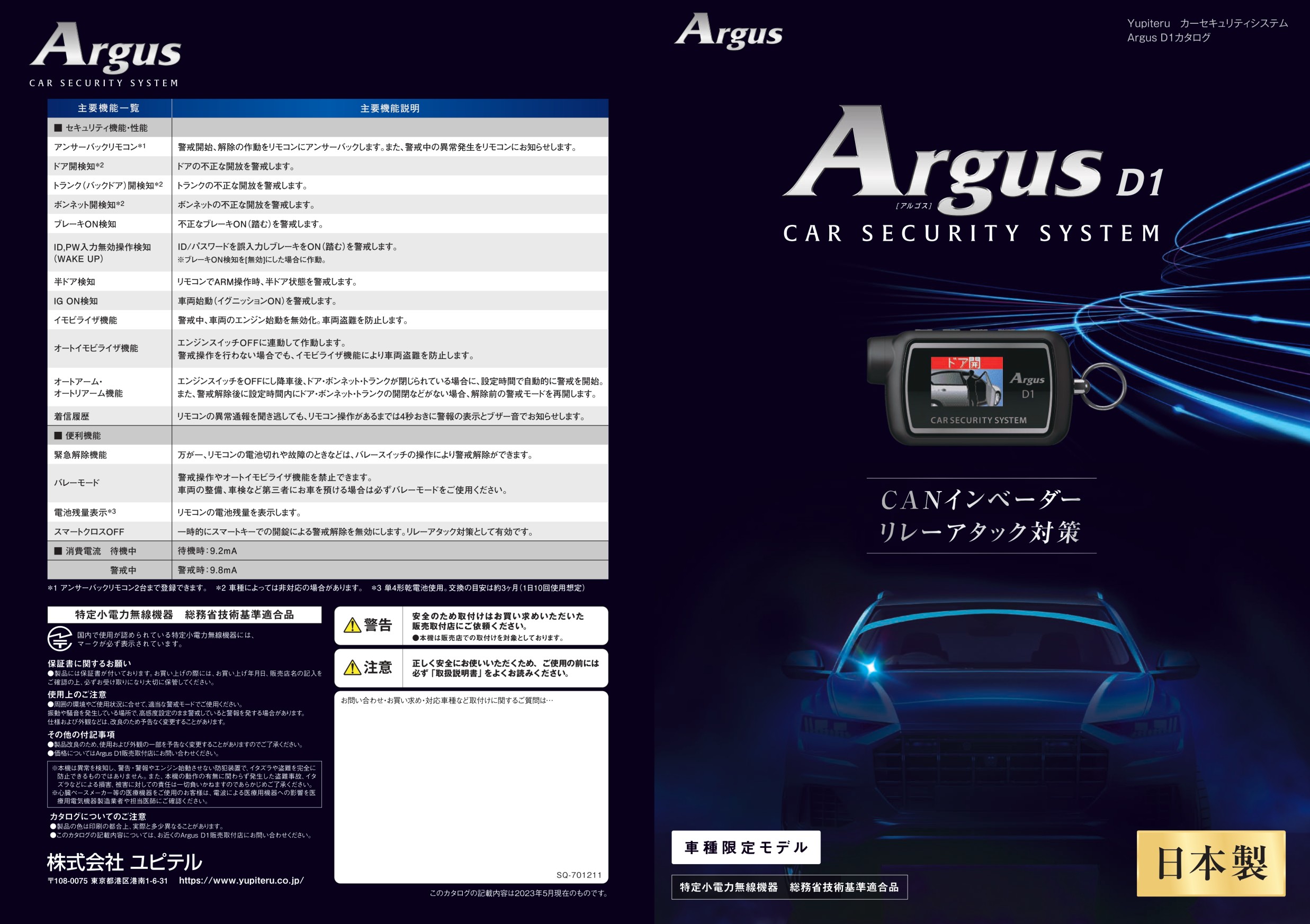 ユピテル製カーセキュリティシステム【Argus D1(アルゴスD1)】