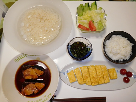 この日のメニューは、そうめんに、サラダにブリの照り焼きに卵焼きと