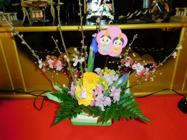 こんにちは。華道教室にて、お雛様用のお花を活けましたよ。