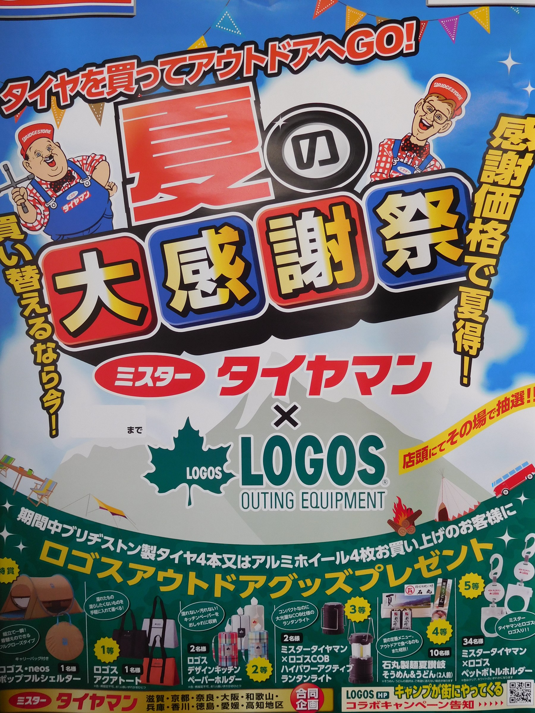 タイヤ及びホイールを4本お買い上げの方には、「ロゴスアウトドアグッズプレゼント」がその場で当たります!空くじなしになっております。