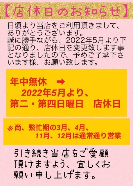<店休日のお知らせ> 2022年2月10日 ~店休日のお知らせ~ 日頃より当店をご利用頂きまして、ありがとうございます。 誠に勝手ながら、2022年5月より下記の通り店休日を変更いたします事となりましたので、 予めご了承くださいますよう、お願い致します。 年中無休 ⇒ 5月より、第二・第四日曜日 店休日 ※但し、繁忙期の3、4、11、12月は通常通り営業 引き続き当店をご愛顧頂けますよう、宜しくお願い申し上げます。