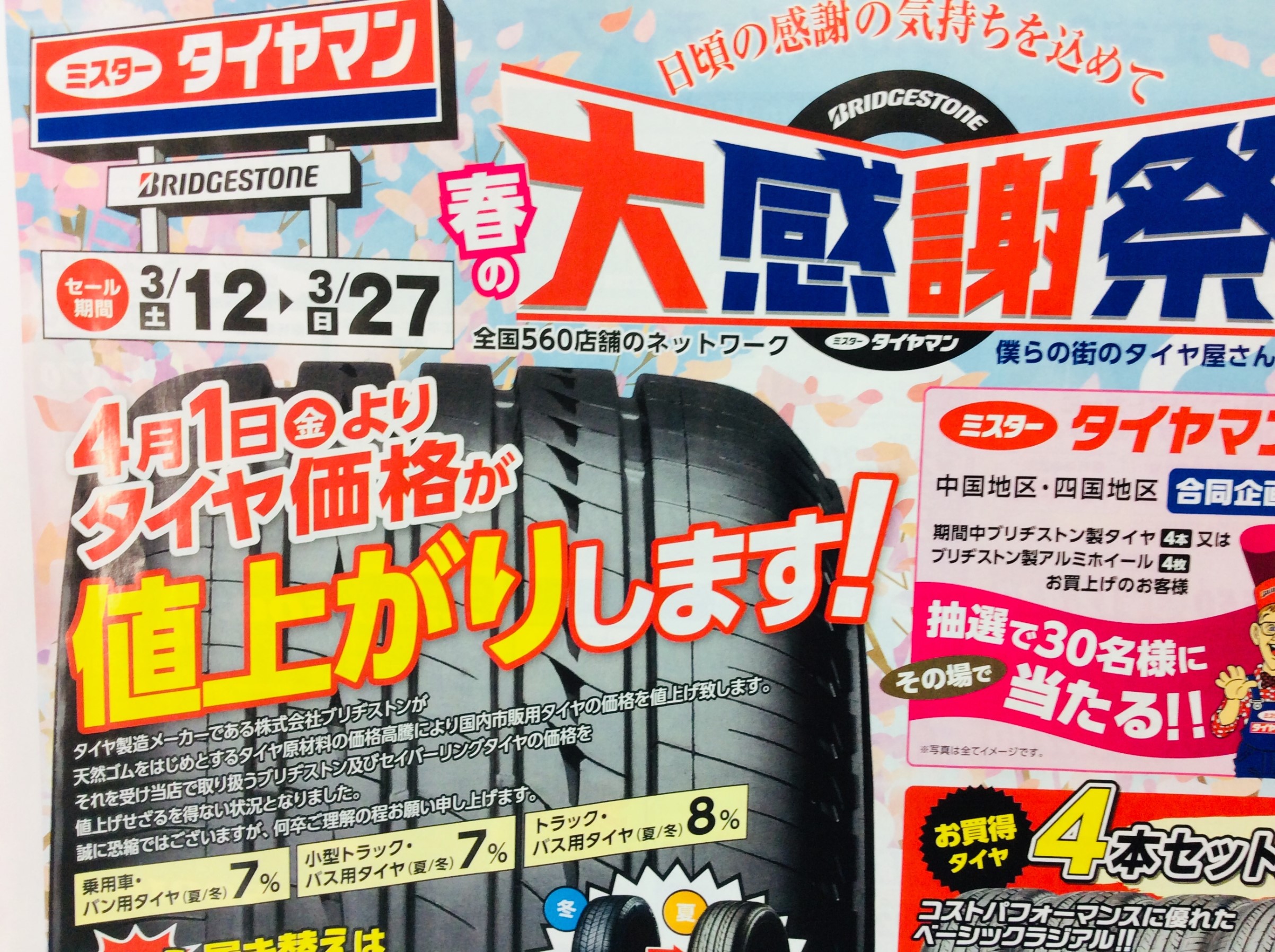 4月からのタイヤが7%値上がり致しますので、値上がり前の今が大変お買い得となっております。