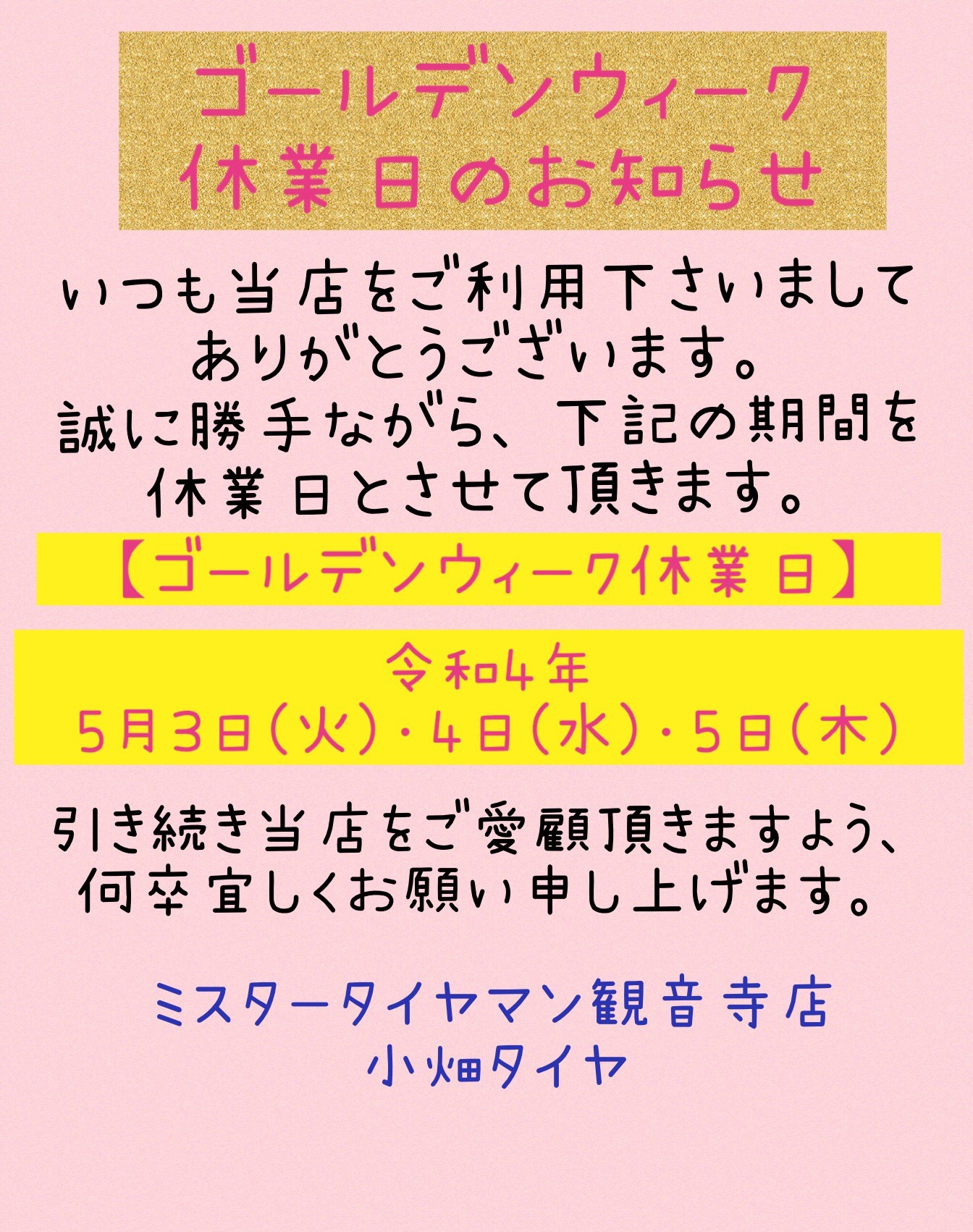 ゴールデンウィーク休業日のお知らせです。
