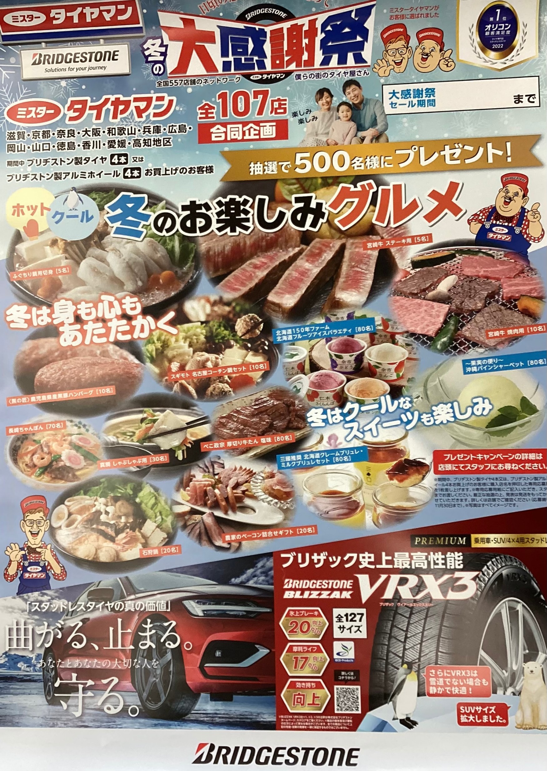 タイヤ4本ご購入のお客様には、冬のお楽しみグルメが抽選で当たります。