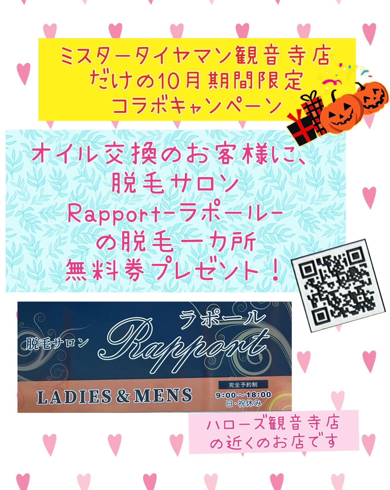 10月期間限定コラボキャンペーンのご案内<観音寺店のみ> 2023年10月23日 10月のみの期間限定コラボキャンペーンのご案内です! オイル交換をして頂いたお客様に 脱毛サロンRapport~ラポール~さんの 脱毛一か所(ひじ下・ひざ下・脇・鼻下etc)無料券をプレゼント! このお得な機会に是非ご来店下さい(*'ω'*)