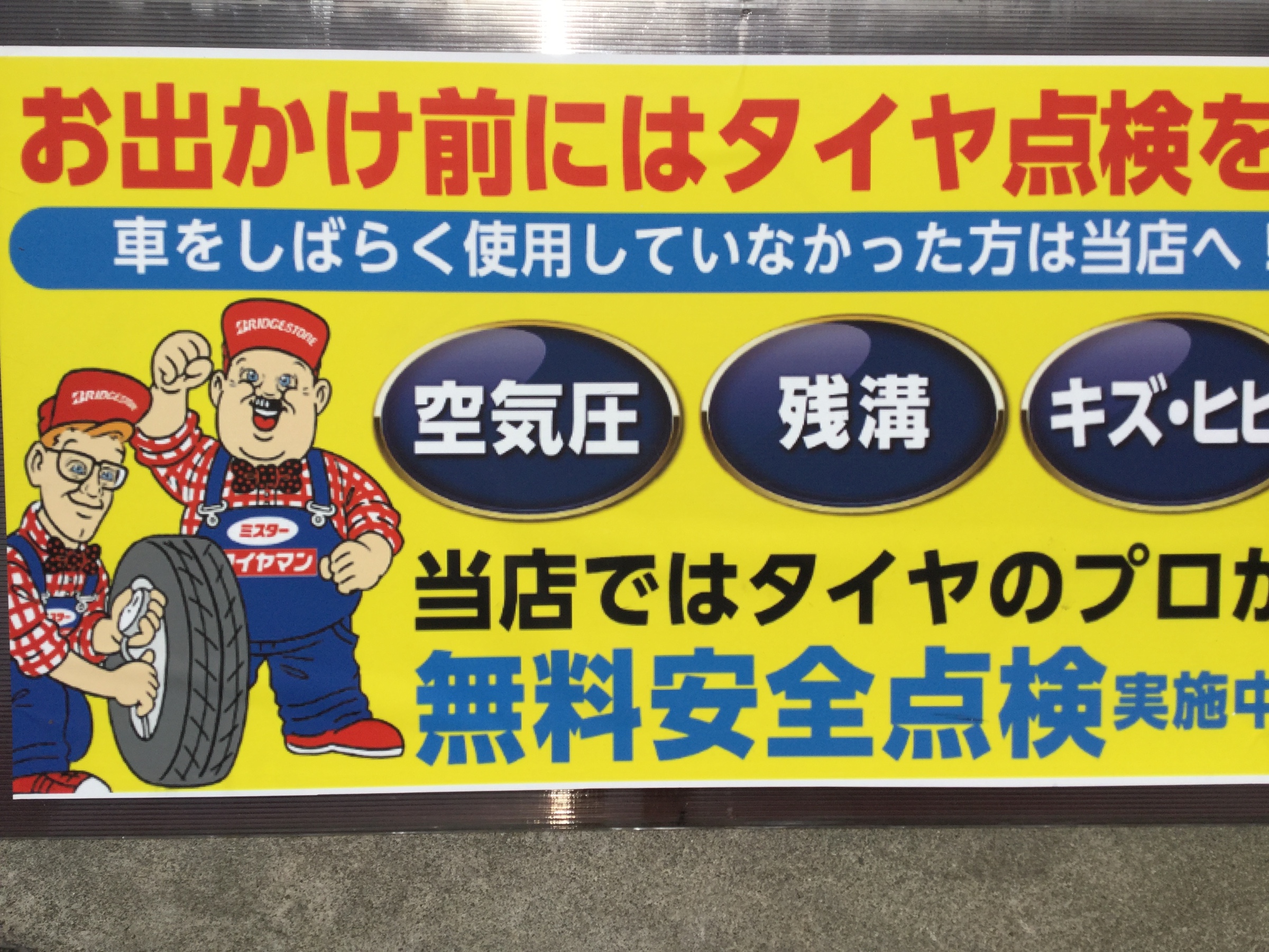 ミスタータイヤマン全店舗で無料安全点検を行っています。是非お越しください。