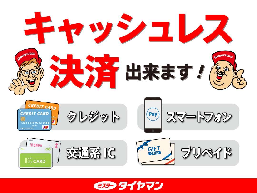 キャッシュレス決済ご利用になれます。 2025年1月24日 キャッシュレス決済ご利用になれます。 VISA,MASTER,JCB等のクレジットカード PayPay、d払い、aupay、Rpay等のQR決済 Smart code、交通系電子マネー等 上記以外のご利用も随時利用可能になりますので、詳しくは当店スタッフにお尋ね下さい。 ミスタータイヤマンでは、全店安全点検を無料で行なっております。 お出かけ前に是非お立ち寄りください。